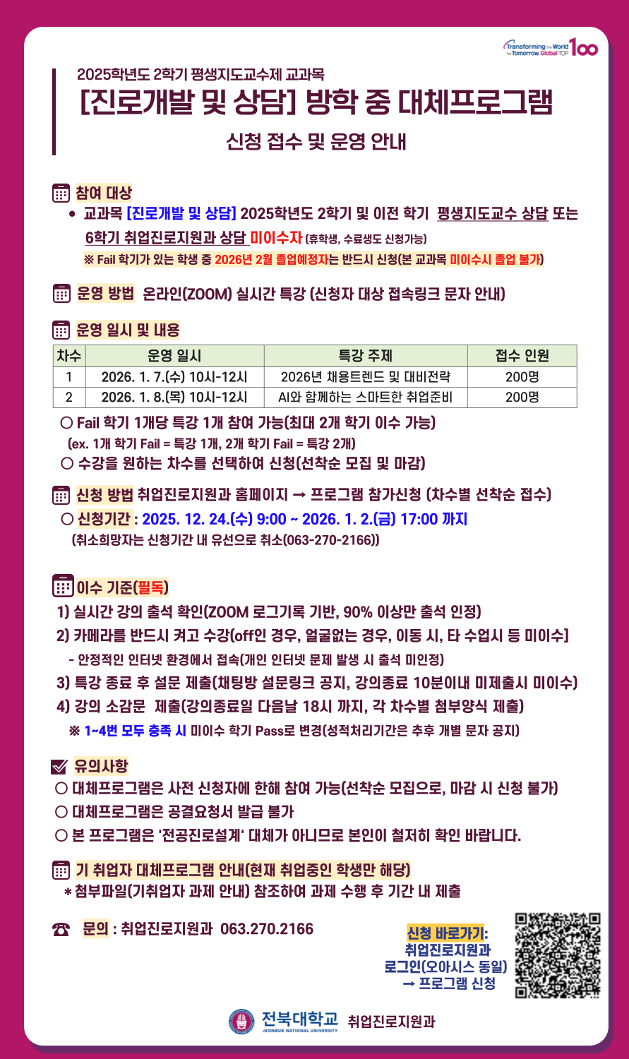 평생지도교수제 교과목 [진로개발 및 상담] 방학중 대체프로그램 실시 및 참가신청 안내